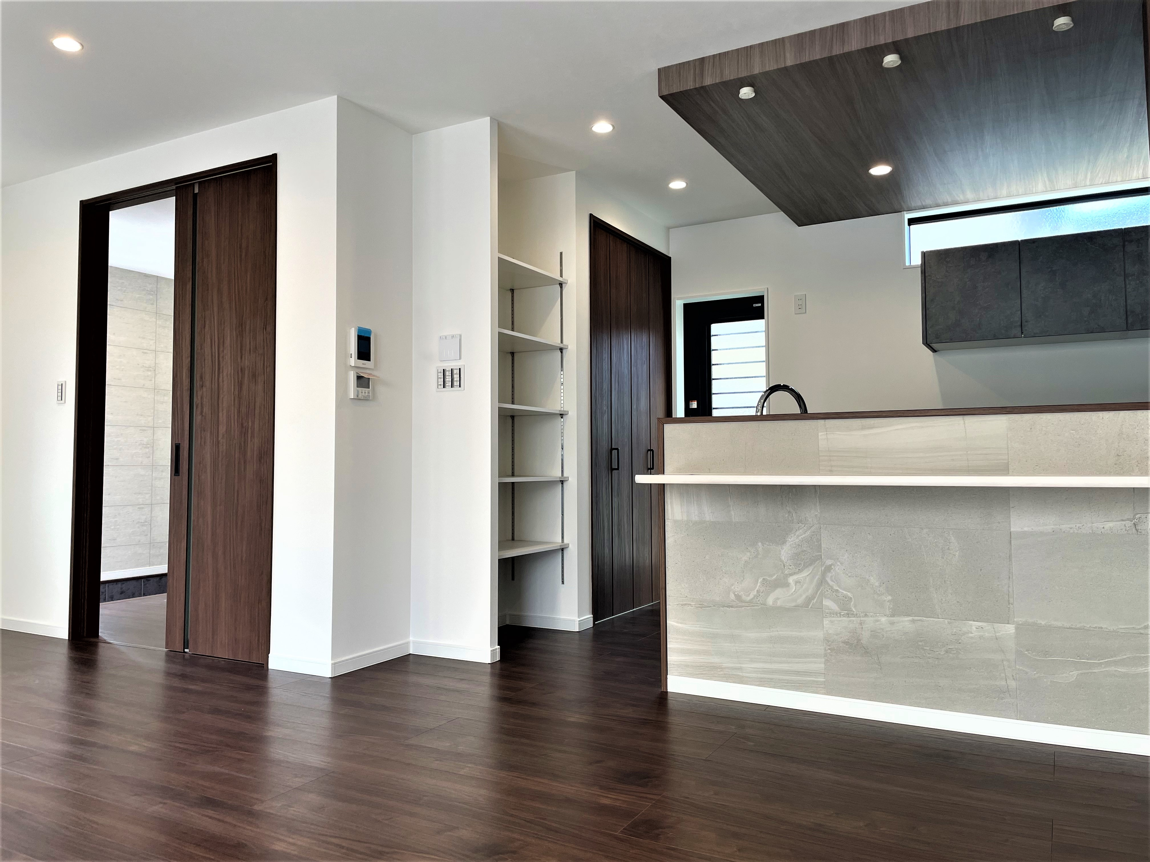 床・建具をダークブラウン色にしつつ、壁紙のホワイト、中間色としてグレー系のエコカラットを使用してモダンな雰囲気を再現しました。